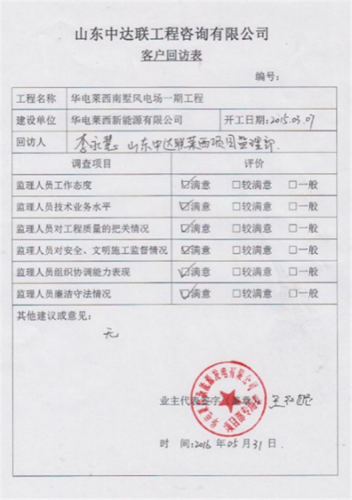 華能蒙城薛湖二期風(fēng)電項(xiàng)目客戶回訪表