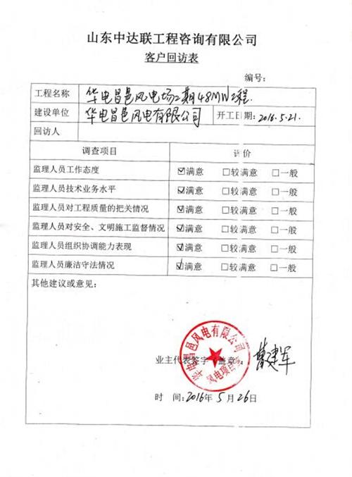 華能蒙城薛湖二期風(fēng)電項目客戶回訪表