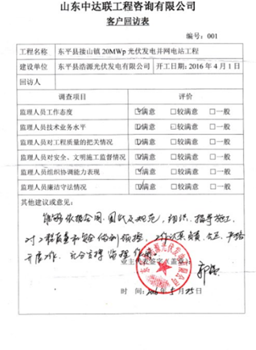 云南華電麗江寧蒗50MW光伏項目客戶回訪表