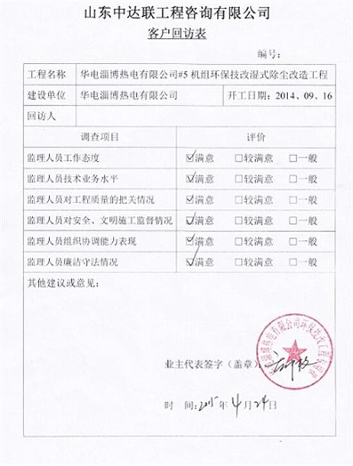 云南華電鎮(zhèn)雄電廠超低排放改造項目客戶回訪表