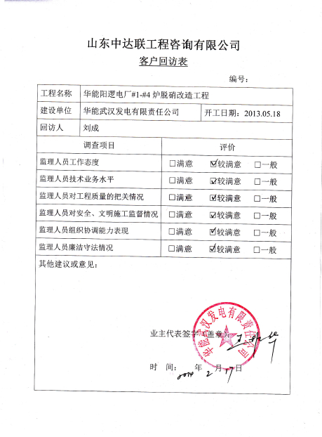 云南華電鎮(zhèn)雄電廠超低排放改造項目客戶回訪表