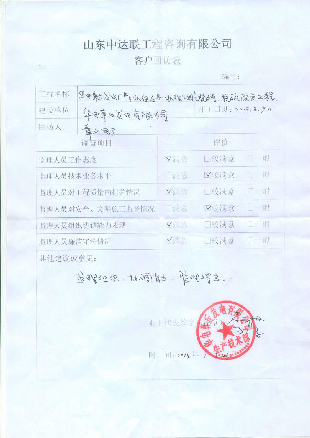 華能嘉祥發(fā)電有限公司回訪表
