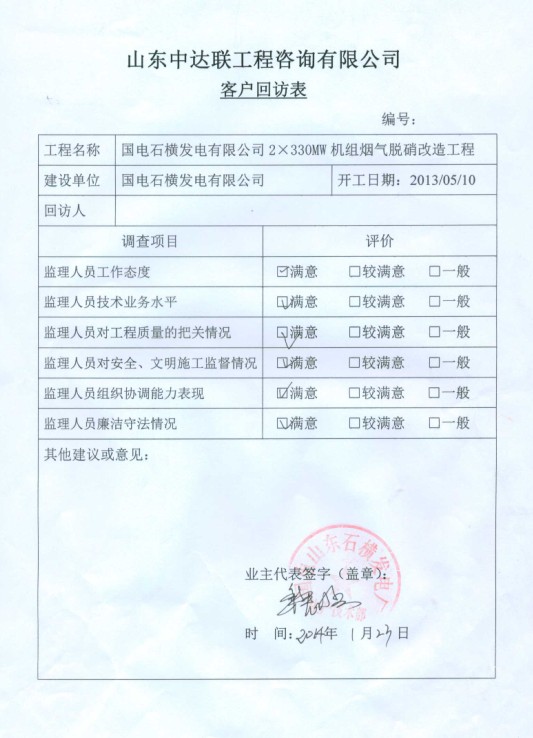 云南華電鎮(zhèn)雄電廠超低排放改造項目客戶回訪表