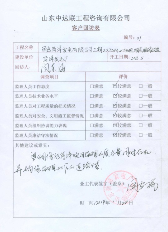 華能蒙城薛湖二期風(fēng)電項目客戶回訪表